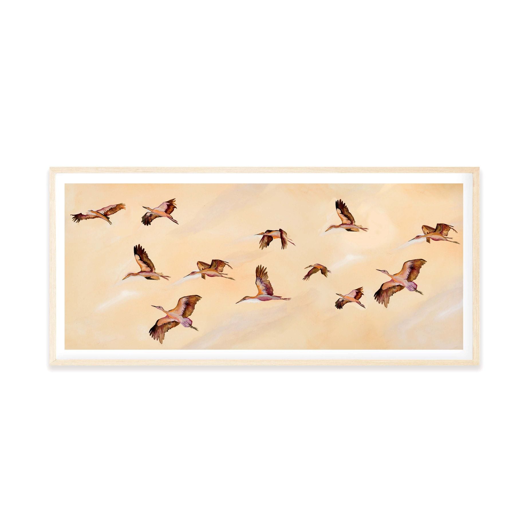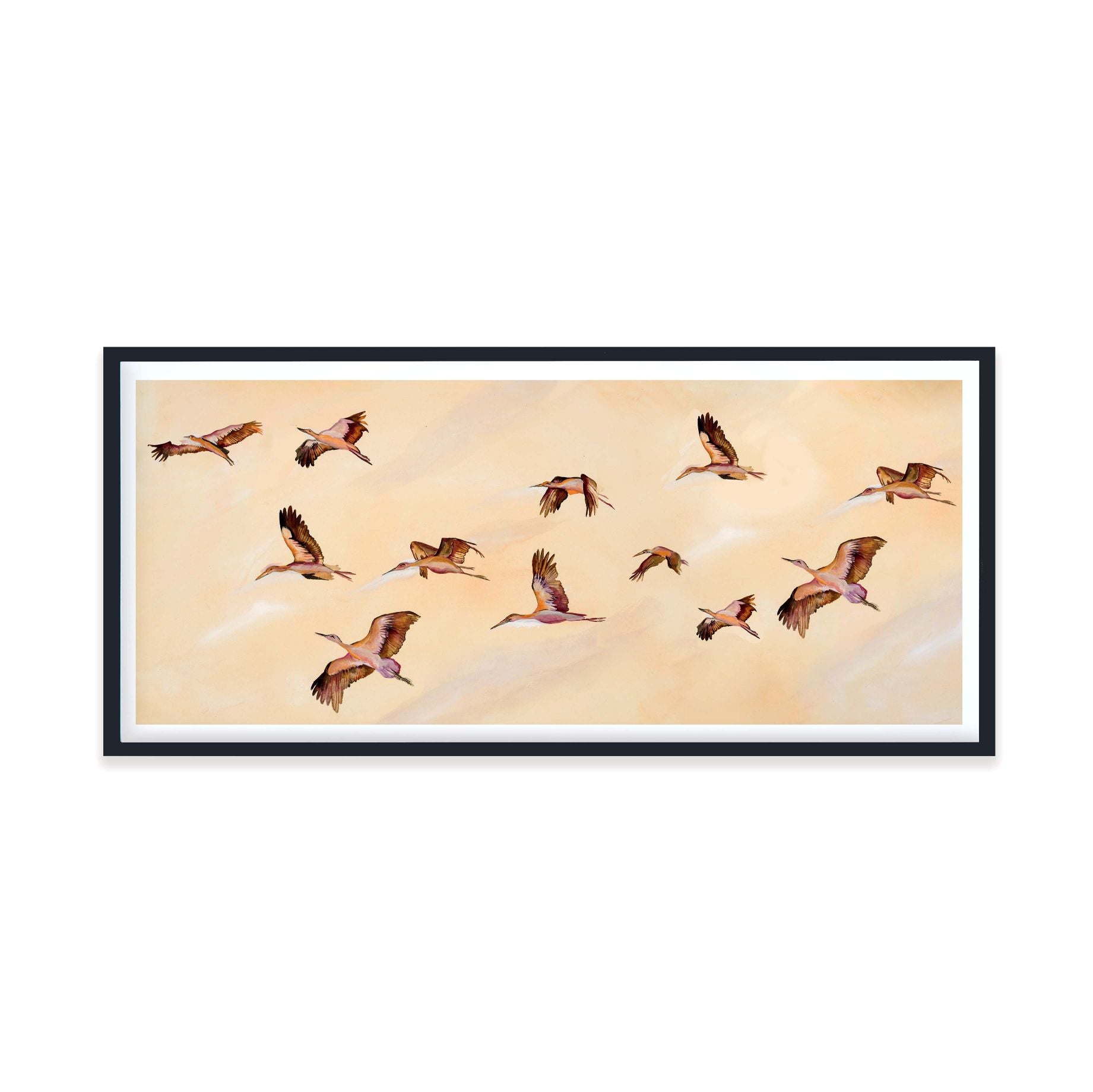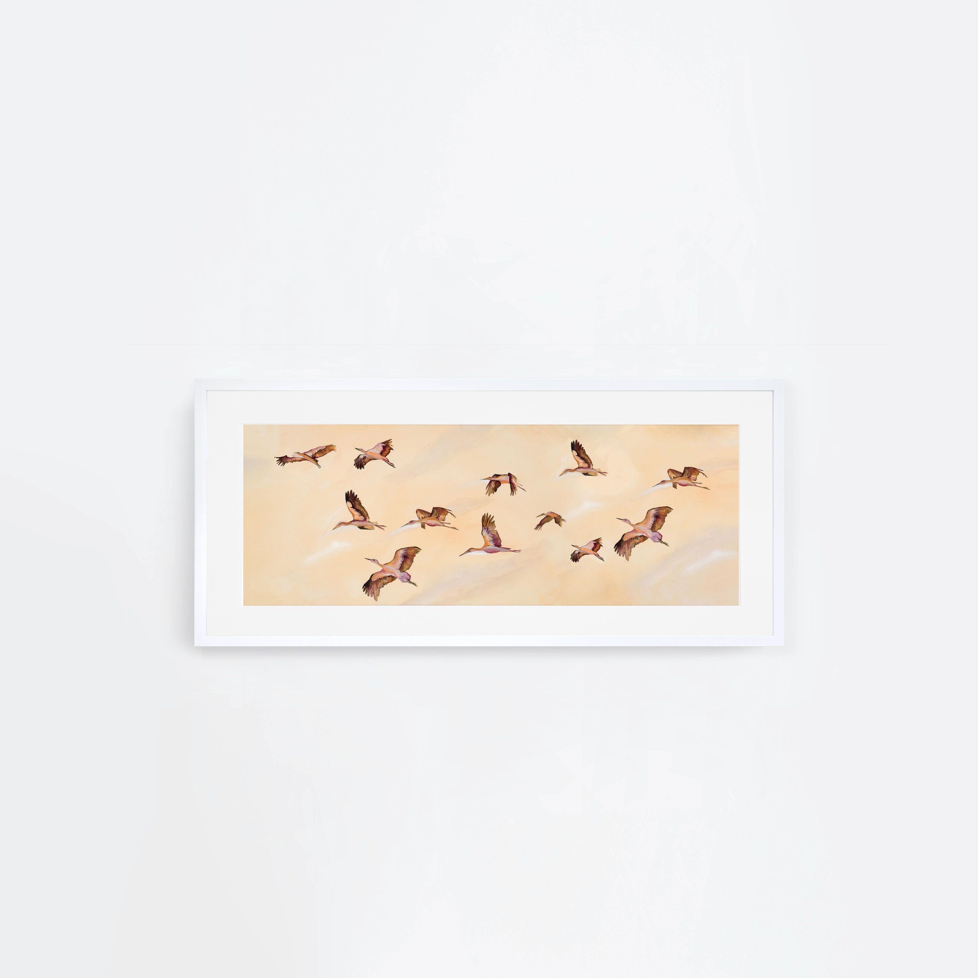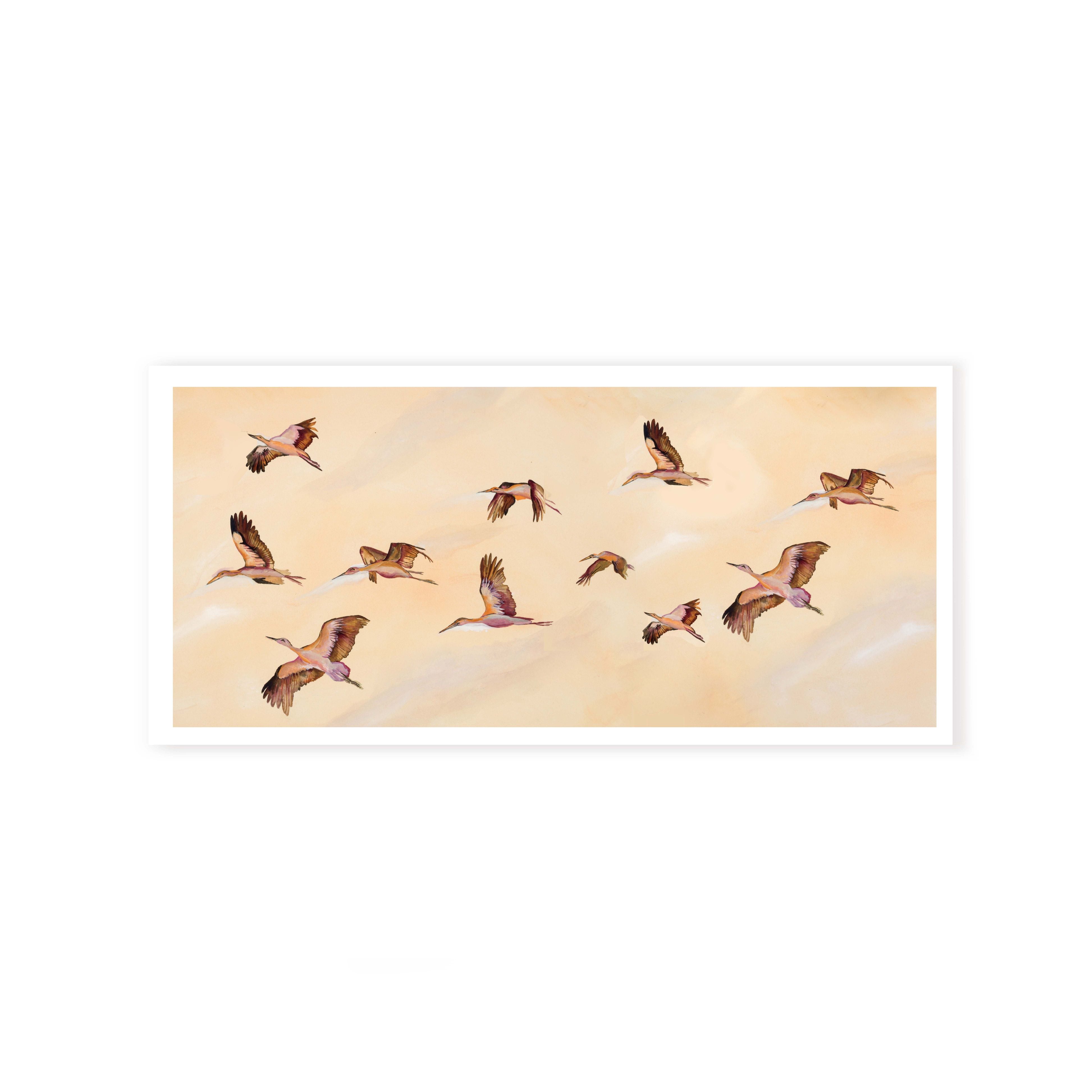 Embracing the serene essence of a flock of birds in graceful flight towards the horizon, bathed in warm, soft pastel tones, this print evokes a sense of tranquility and the gentle embrace of a setting sun.