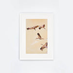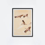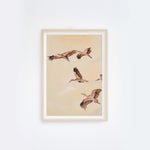 Embracing the serene essence of a flock of birds in graceful flight towards the horizon, bathed in warm, soft pastel tones, this print evokes a sense of tranquility and the gentle embrace of a setting sun.