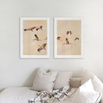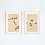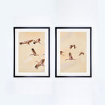 Embracing the serene essence of a flock of birds in graceful flight towards the horizon, bathed in warm, soft pastel tones, this print evokes a sense of tranquility and the gentle embrace of a setting sun.