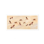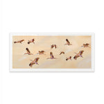 Embracing the serene essence of a flock of birds in graceful flight towards the horizon, bathed in warm, soft pastel tones, this print evokes a sense of tranquility and the gentle embrace of a setting sun.