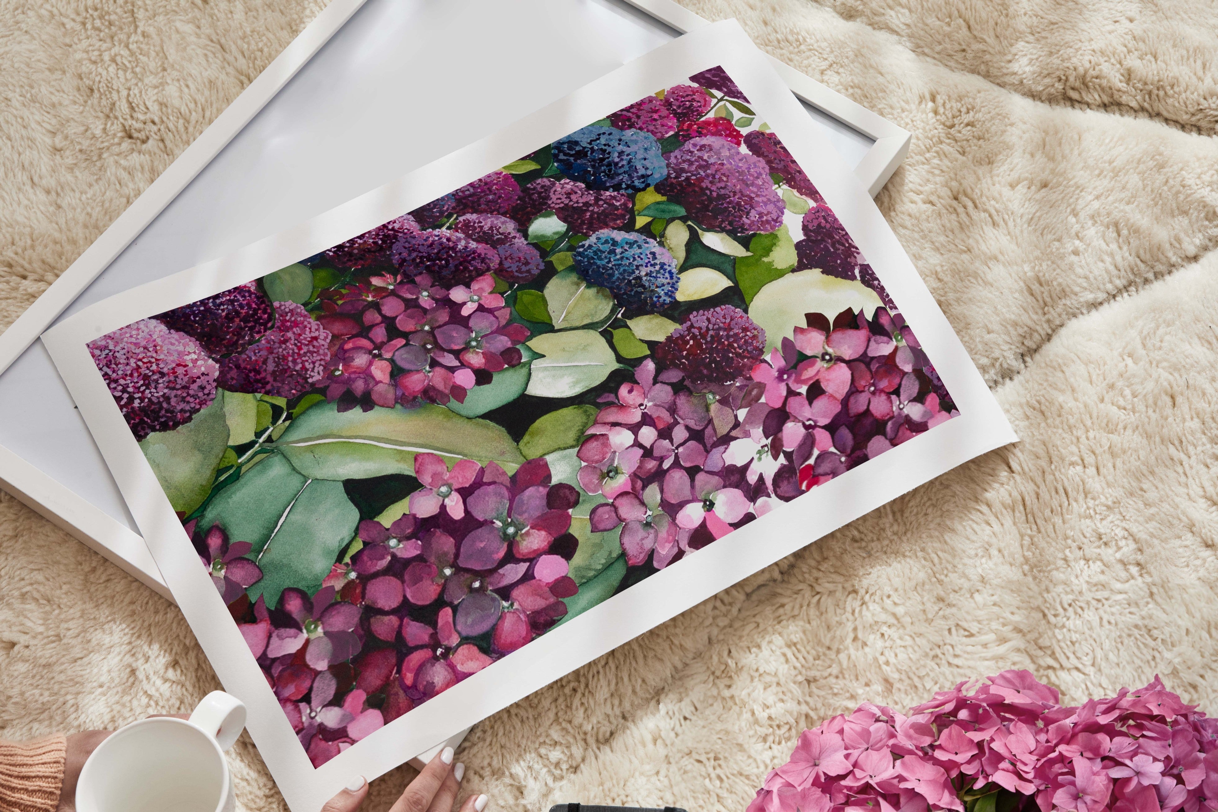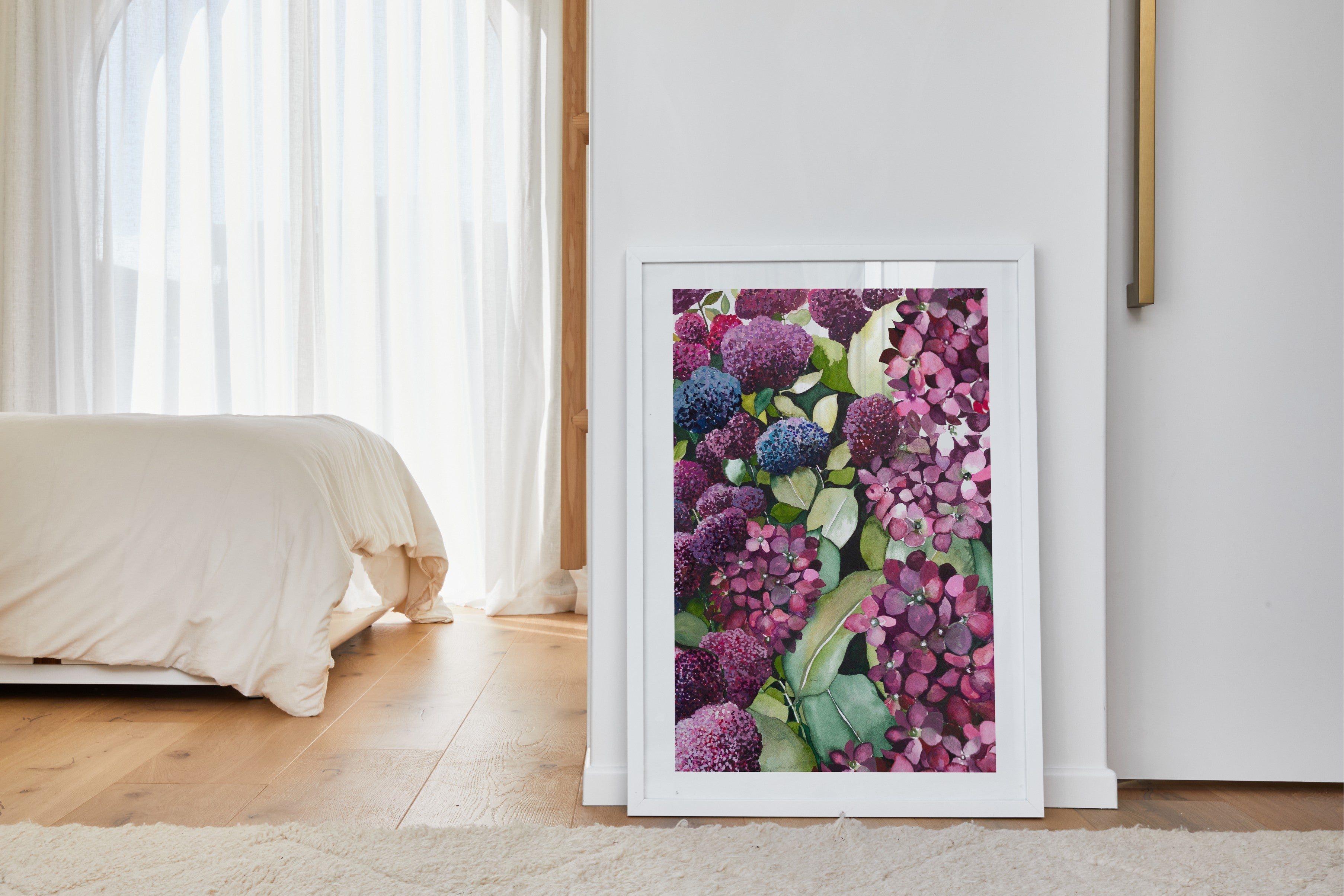 Our Lilac Hydrangea V is one of our vibrant floral pieces, infused with pops of colour, to brighten up your walls