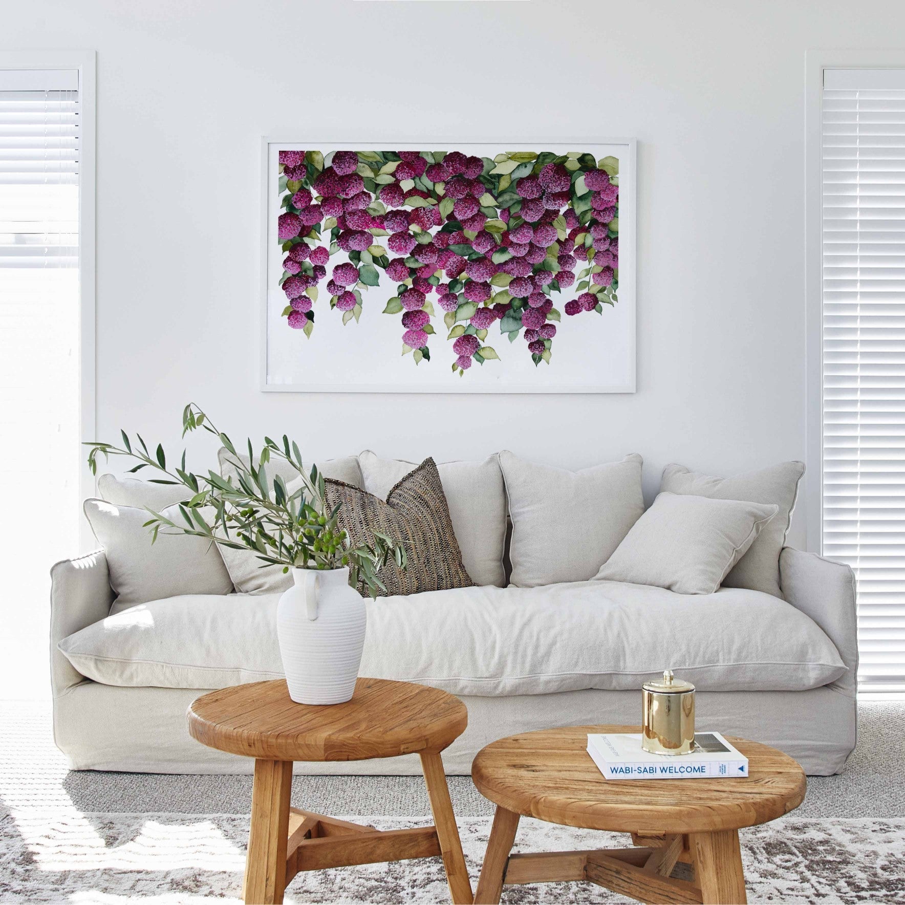 Falling Hydrangeas Landscape is one of our vibrant floral pieces, infused with pops of colour, to brighten up your walls. Uniquely designed by Leden.