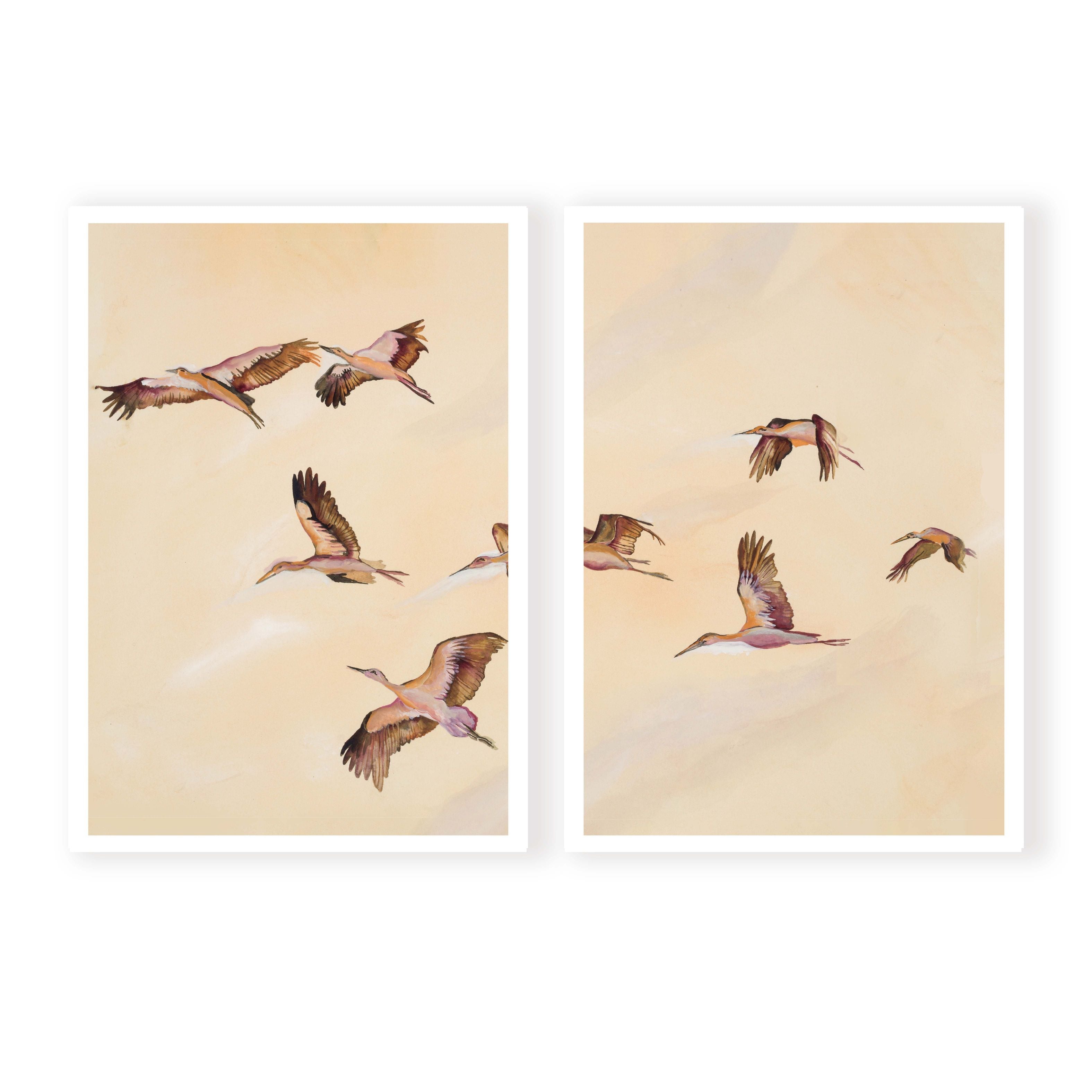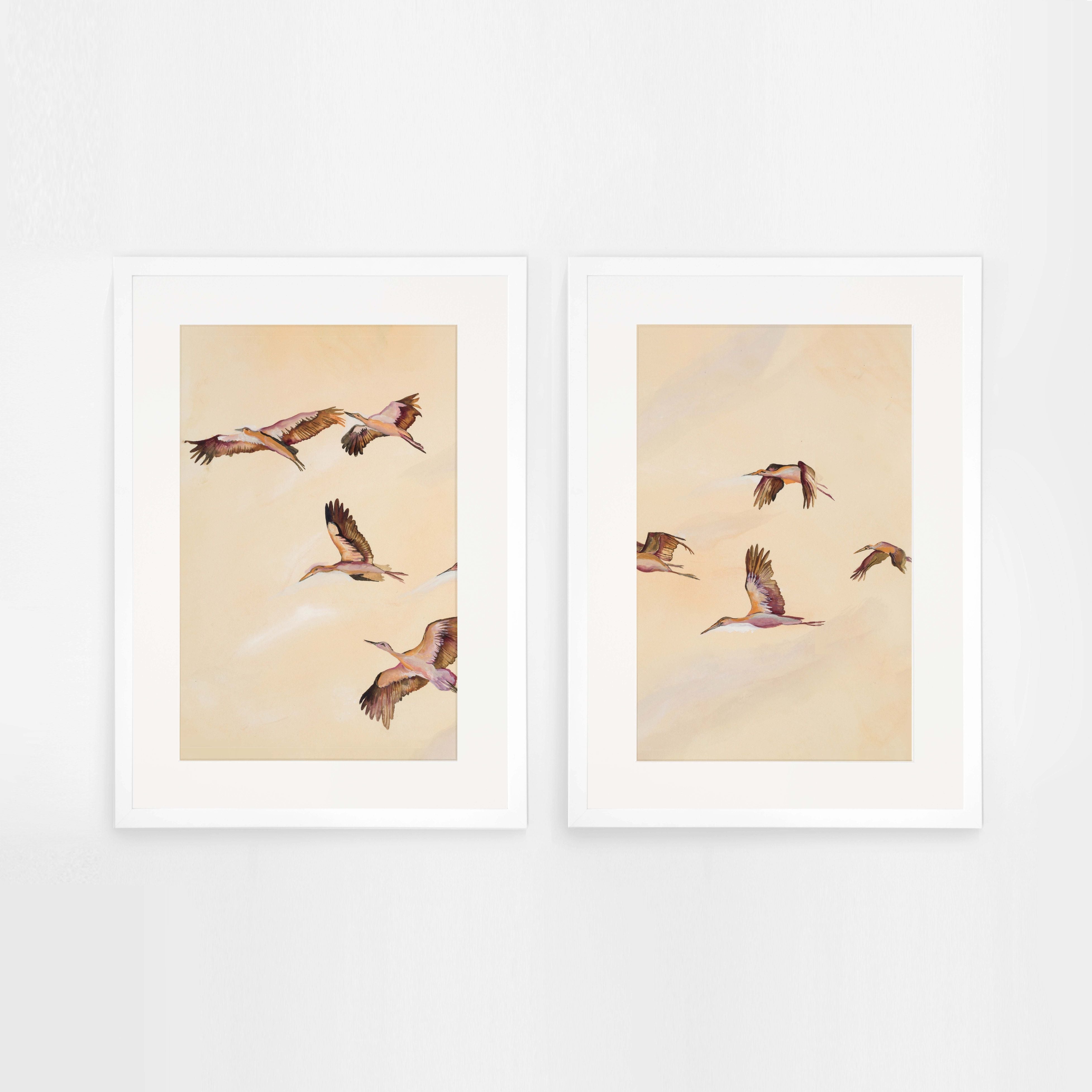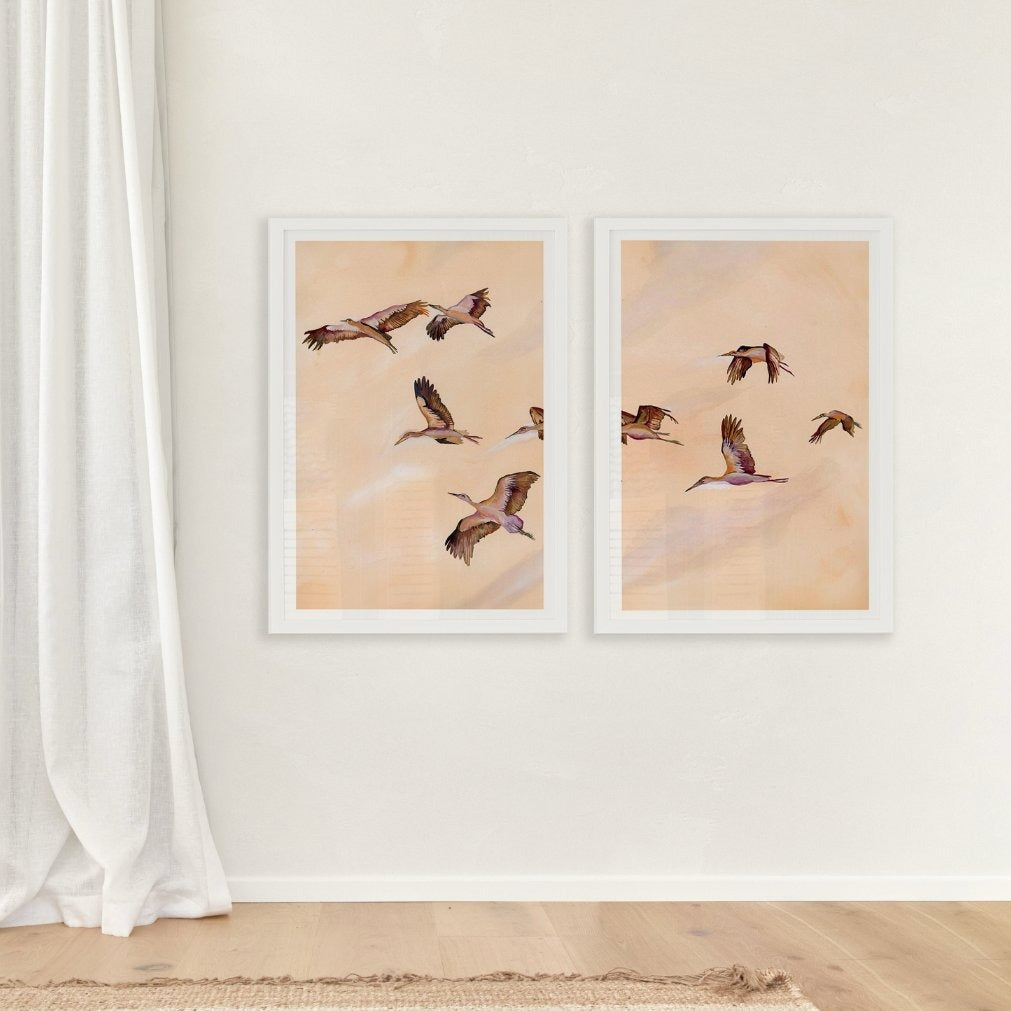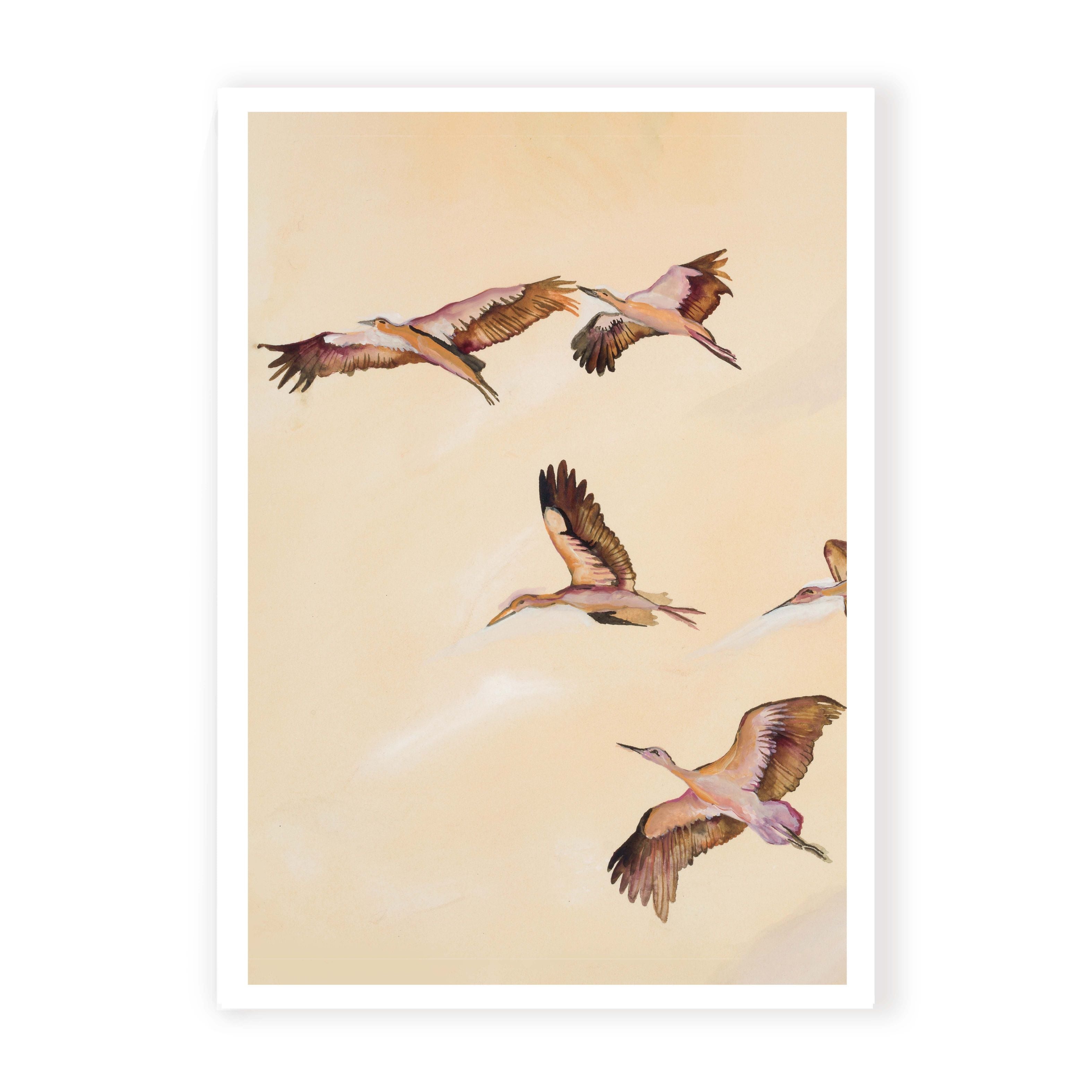 Embracing the serene essence of a flock of birds in graceful flight towards the horizon, bathed in warm, soft pastel tones, this print evokes a sense of tranquility and the gentle embrace of a setting sun.