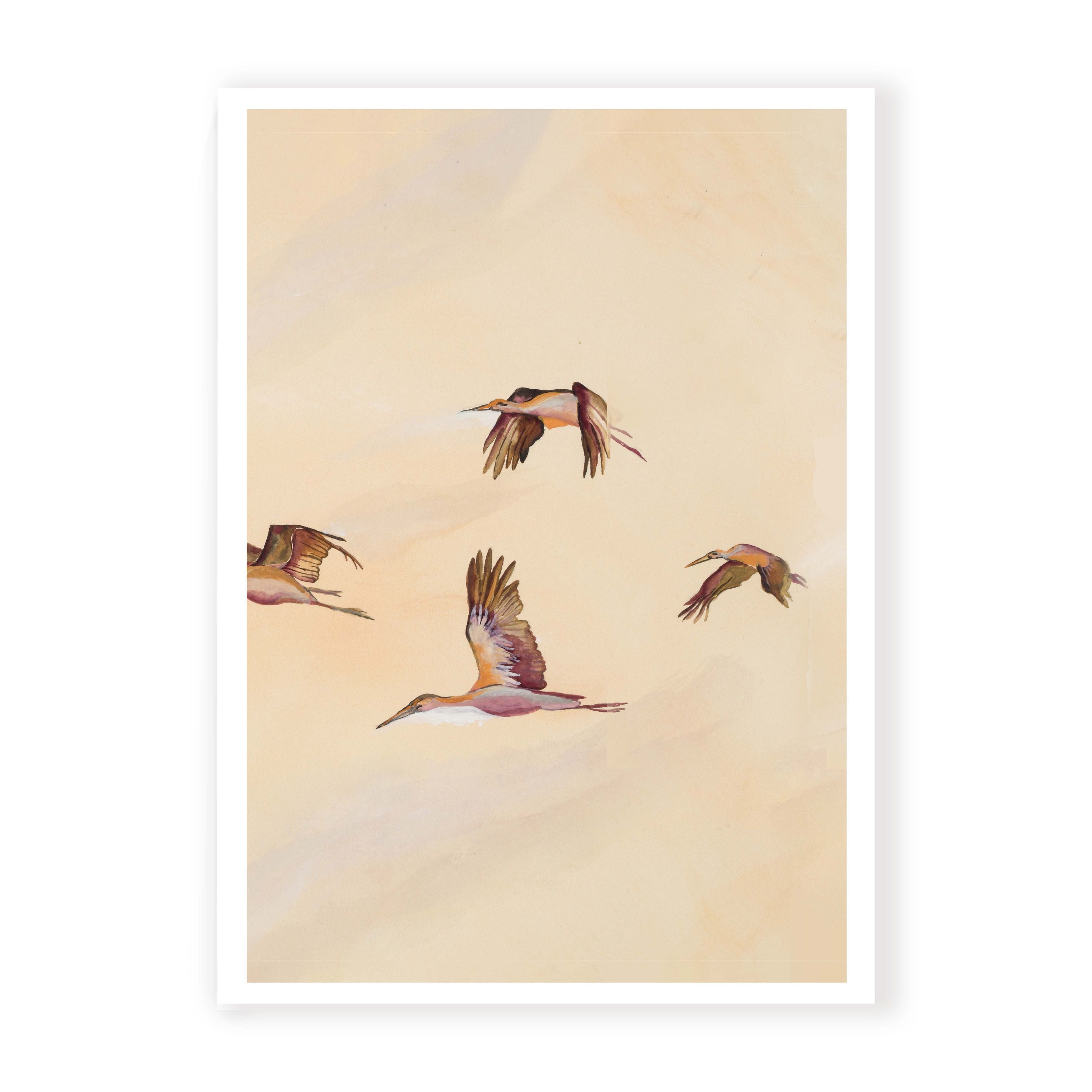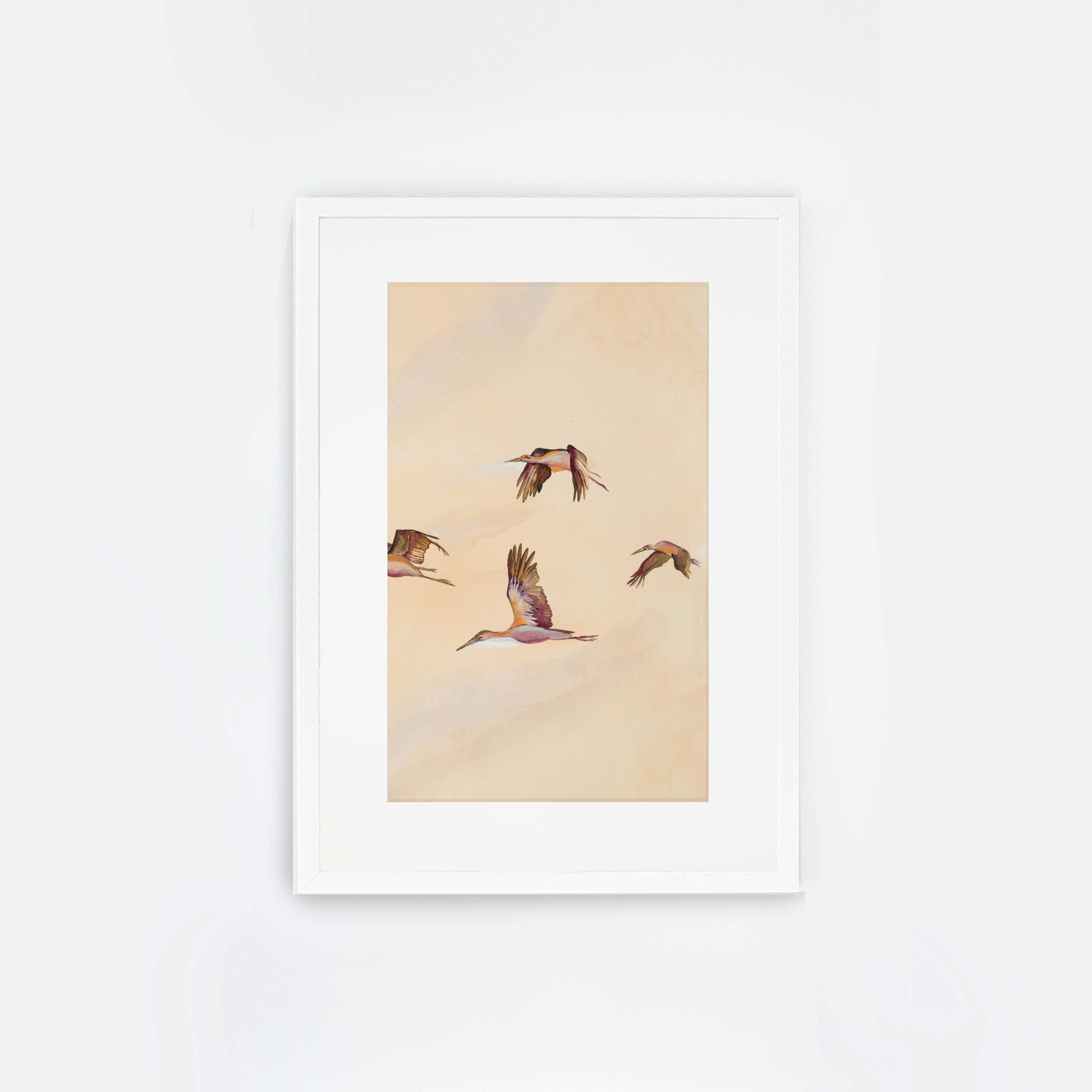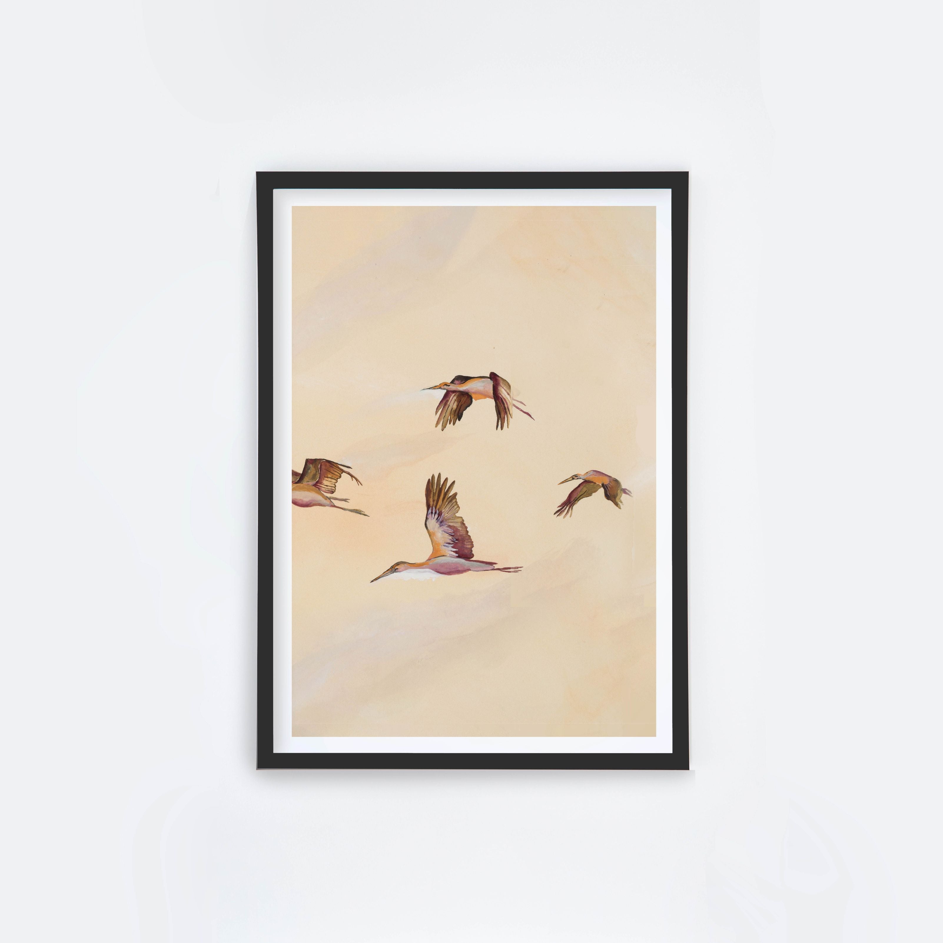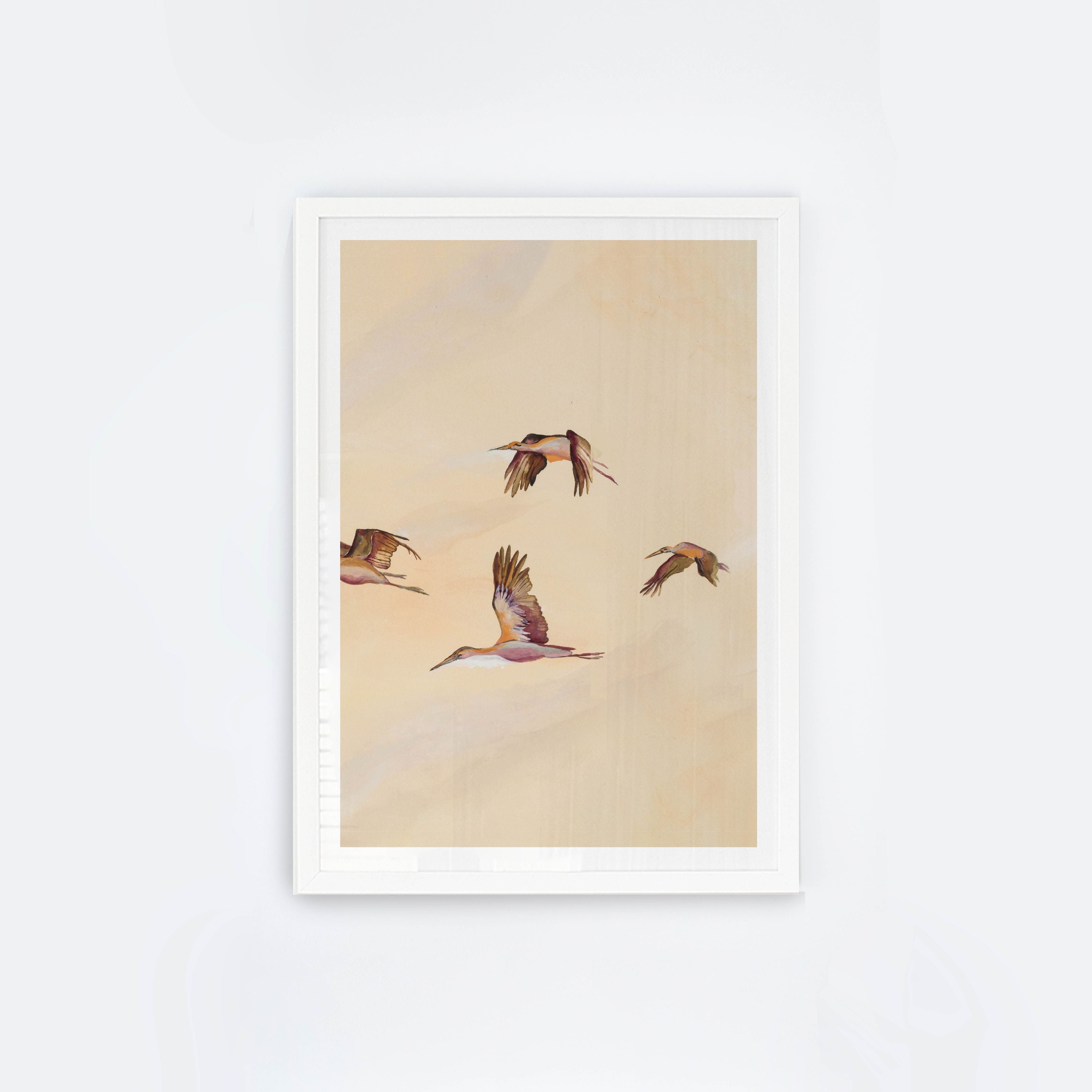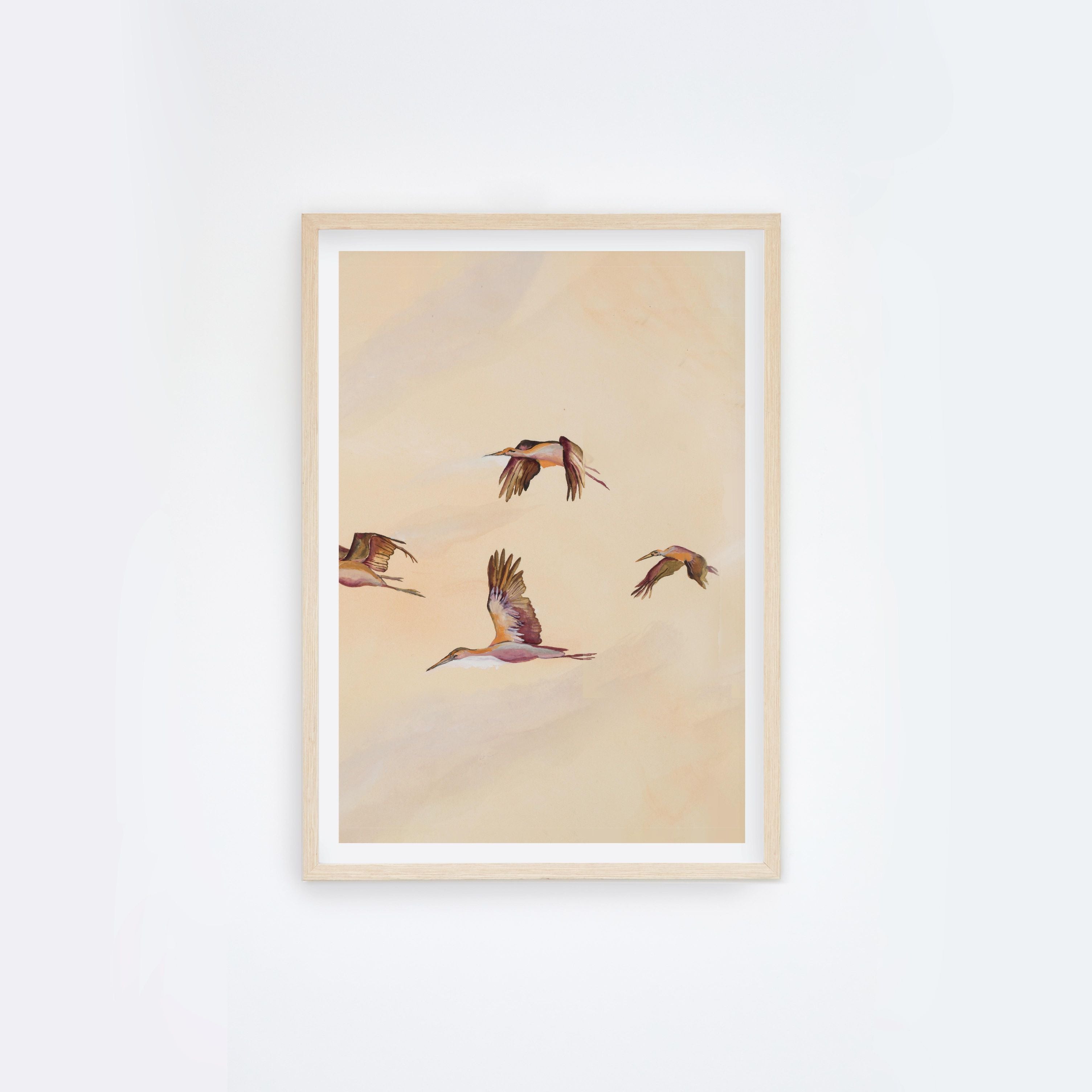 Embracing the serene essence of a flock of birds in graceful flight towards the horizon, bathed in warm, soft pastel tones, this print evokes a sense of tranquility and the gentle embrace of a setting sun.