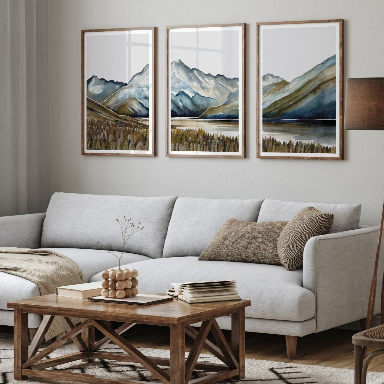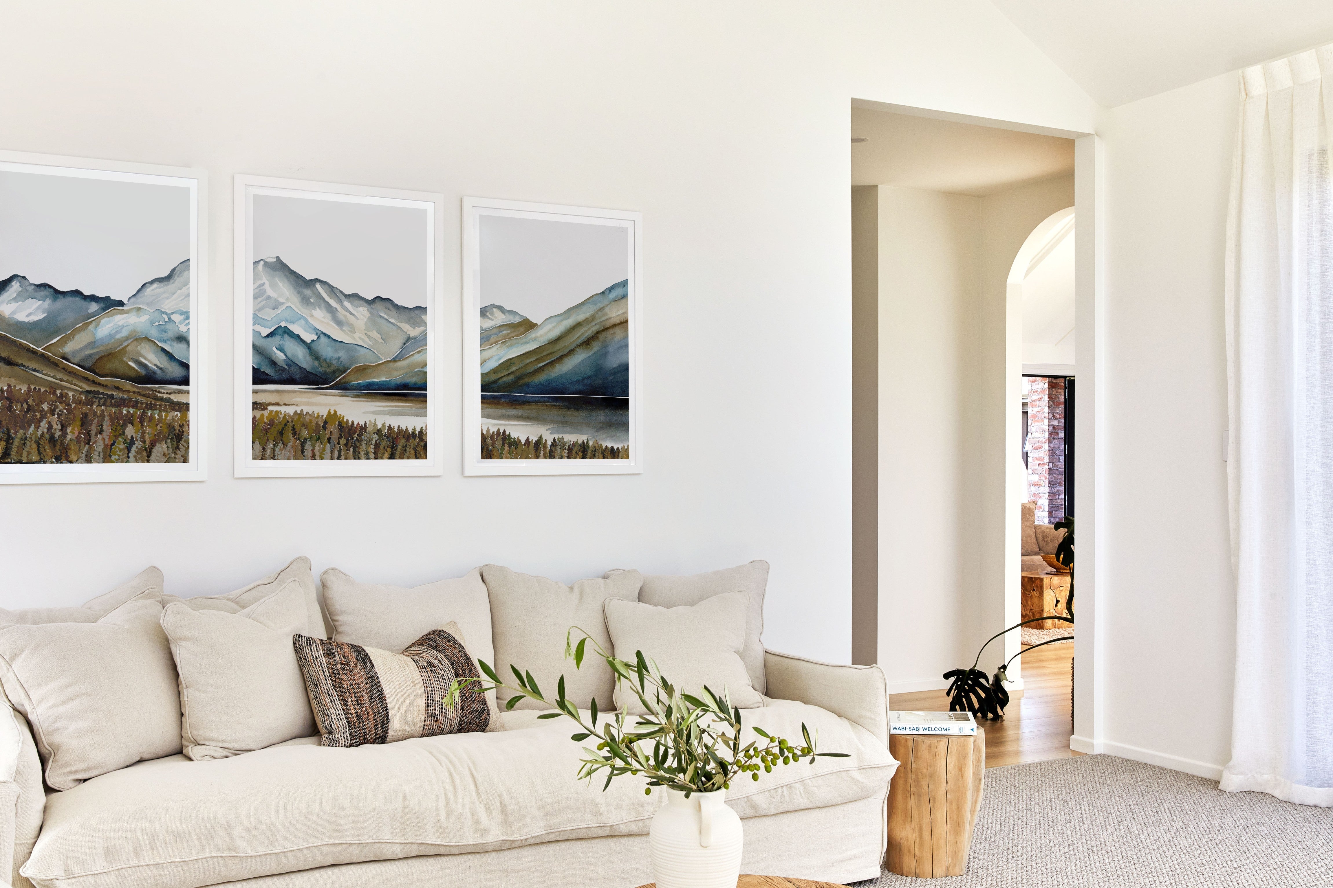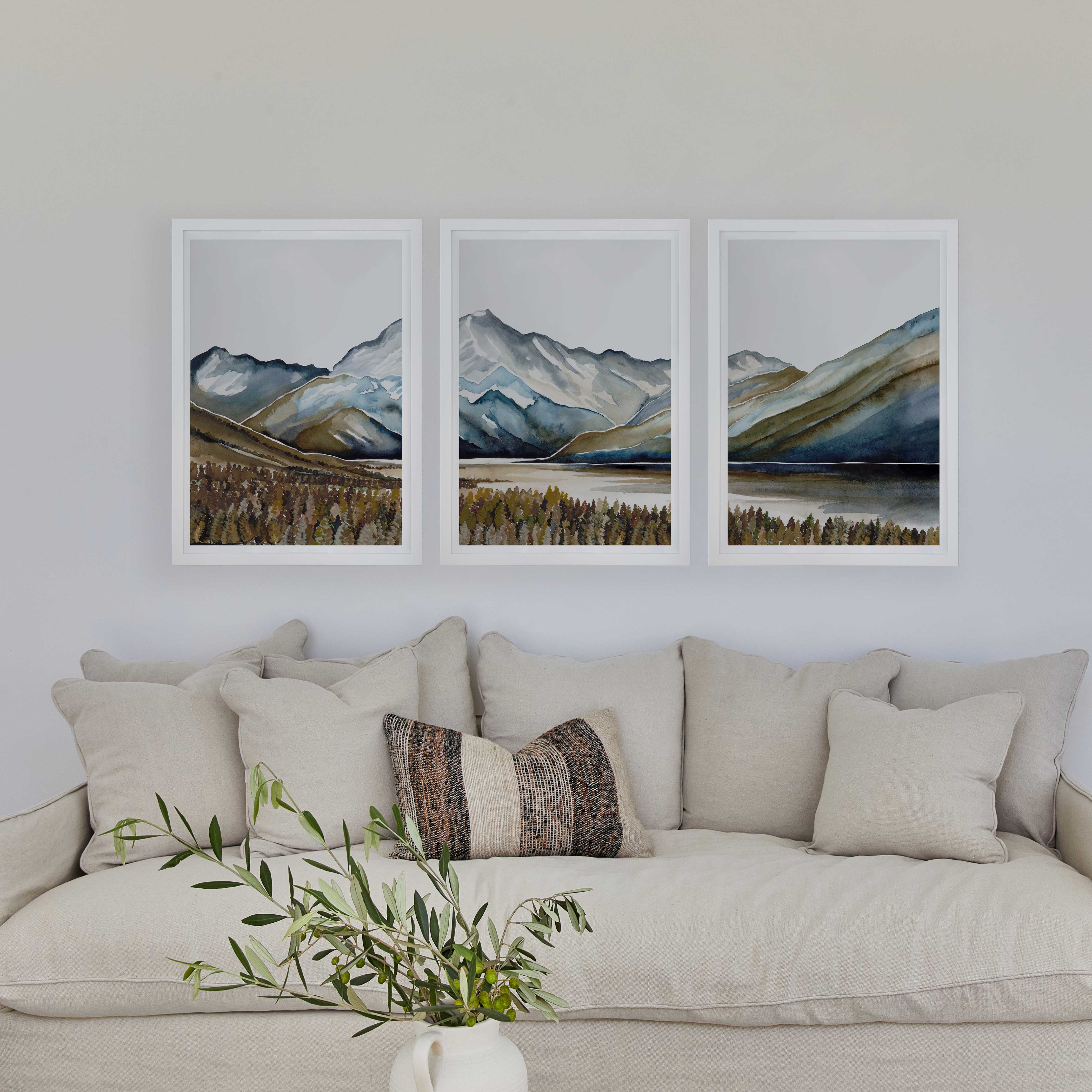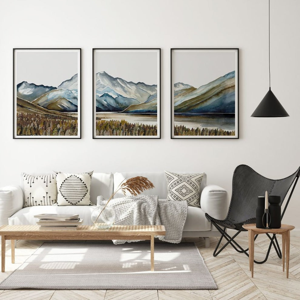 Our Aoraki Triplet is an ode to some of our most incredible mountains and landscapes. Gentle palettes and soft defining shapes, captured through watercolour. This triplet includes: Aoraki I, Aoraki II, Aoraki III. Uniquely designed by Leden, this piece is crafted to create the perfect backdrop for a range of interiors.