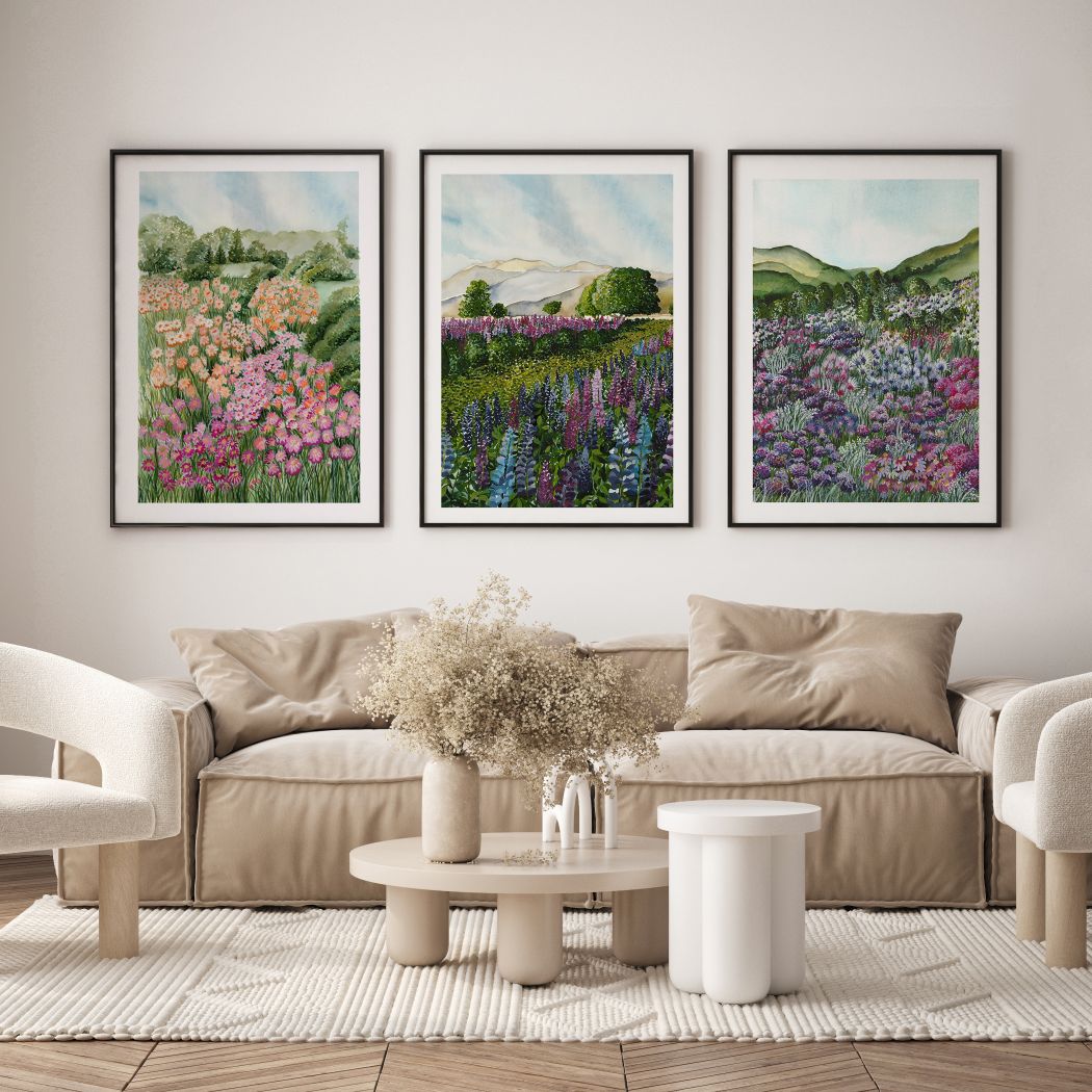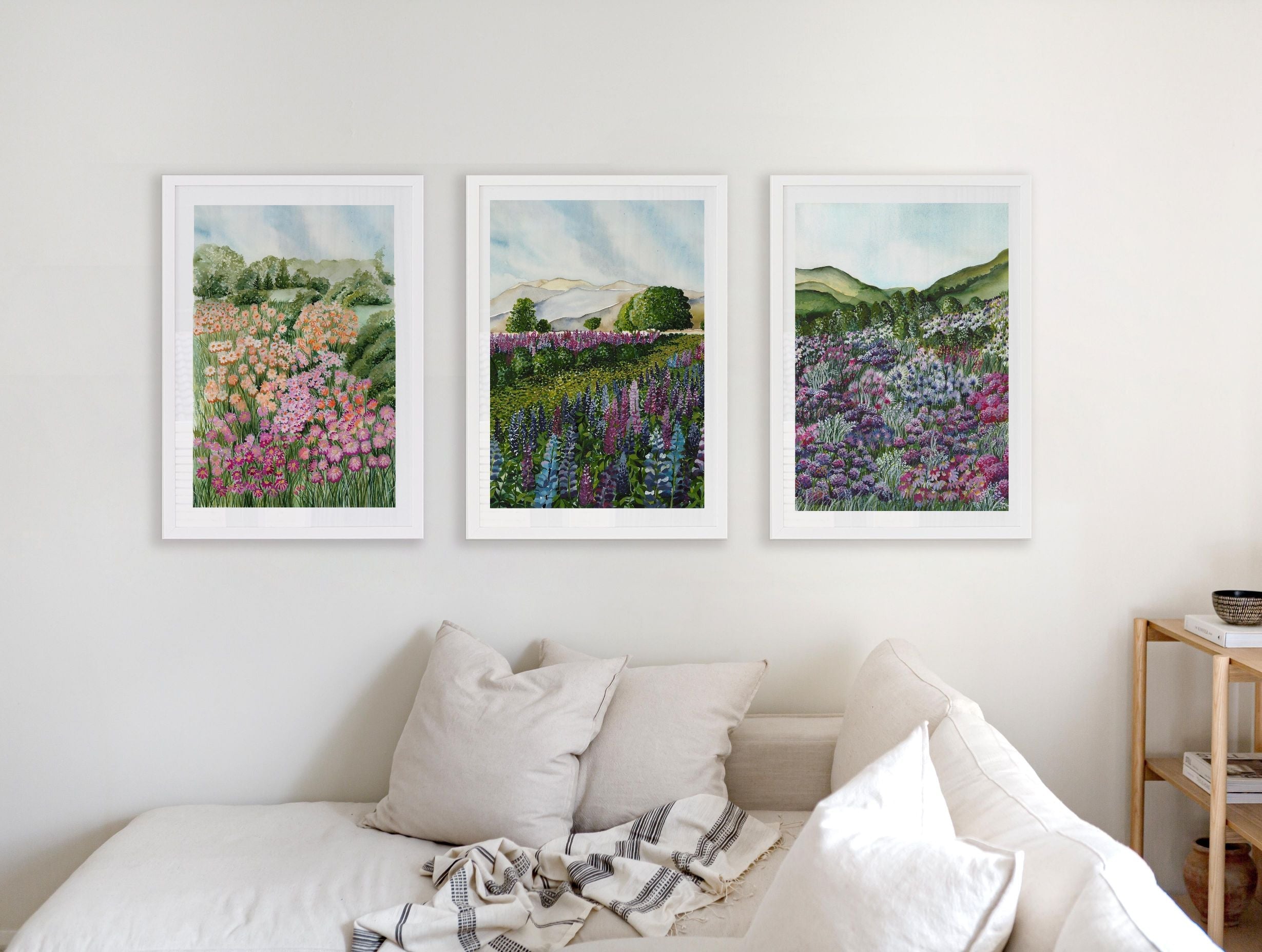 Our Violet Meadow Triplet is one of our vibrant floral pieces, infused with pops of colour, to brighten up your walls. Violet Meadow Triplet is a set of floral artworks which includes: Flower Fields, Lupin Fields II, Wild FLowers II. Uniquely designed by Leden, this piece is crafted to complement our modern interiors.