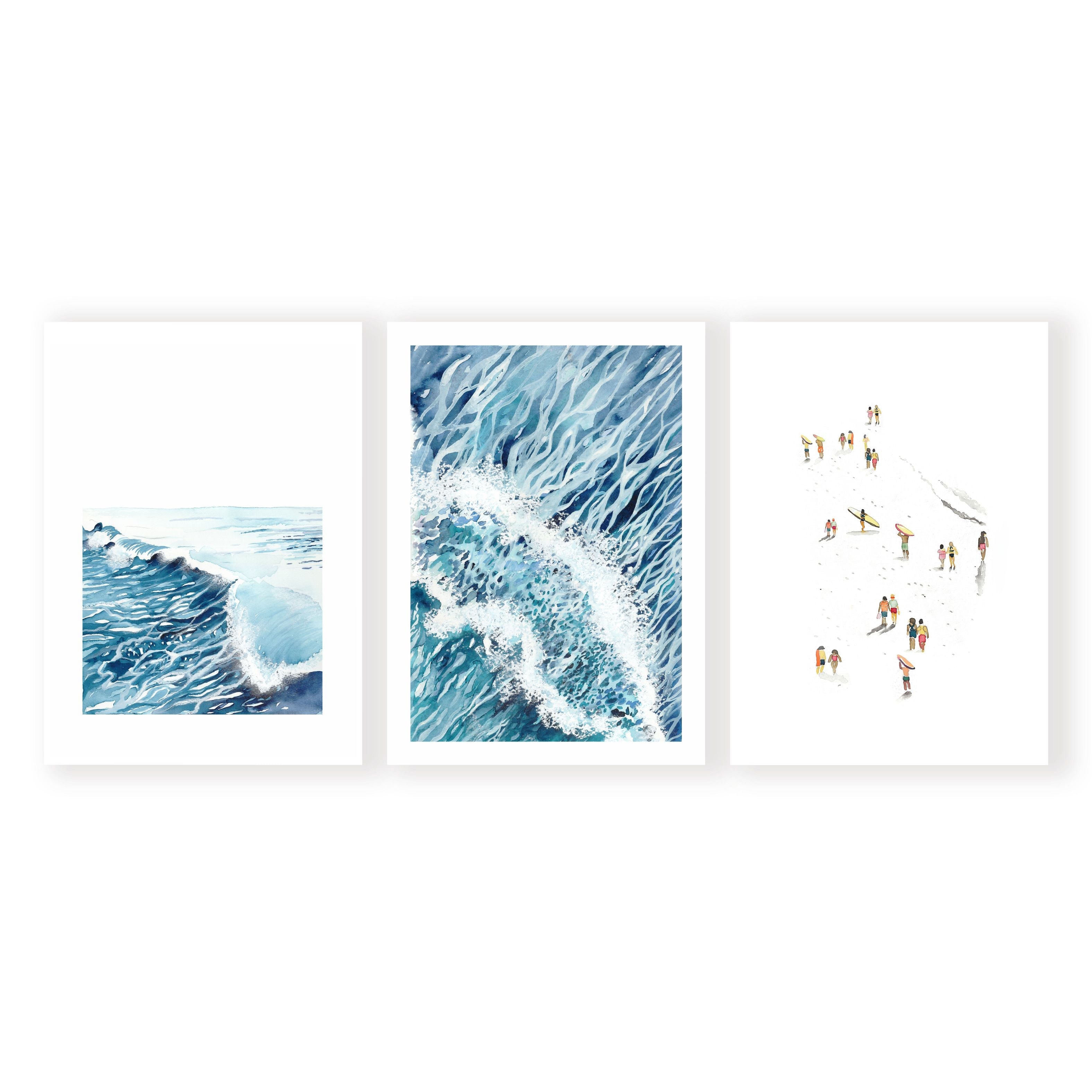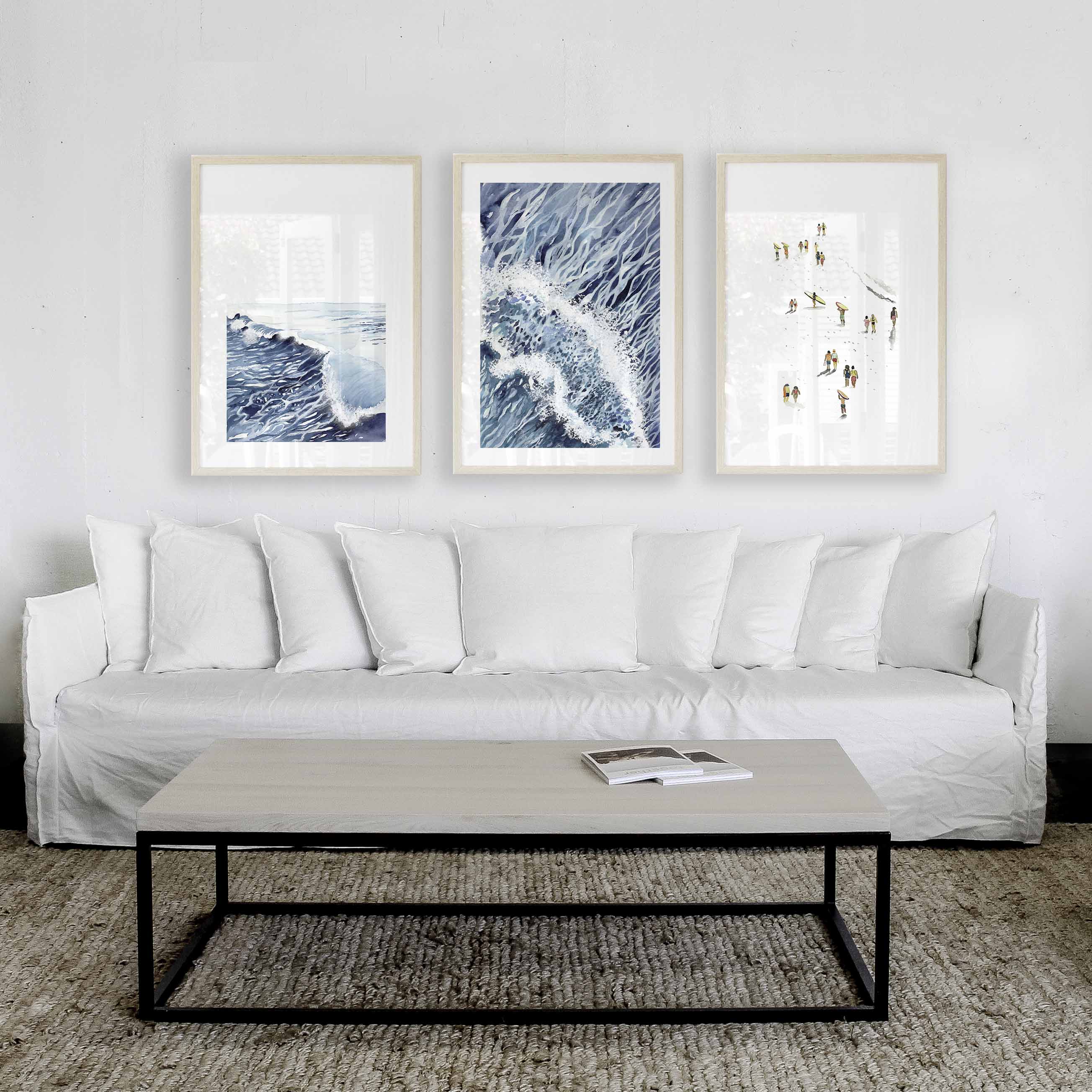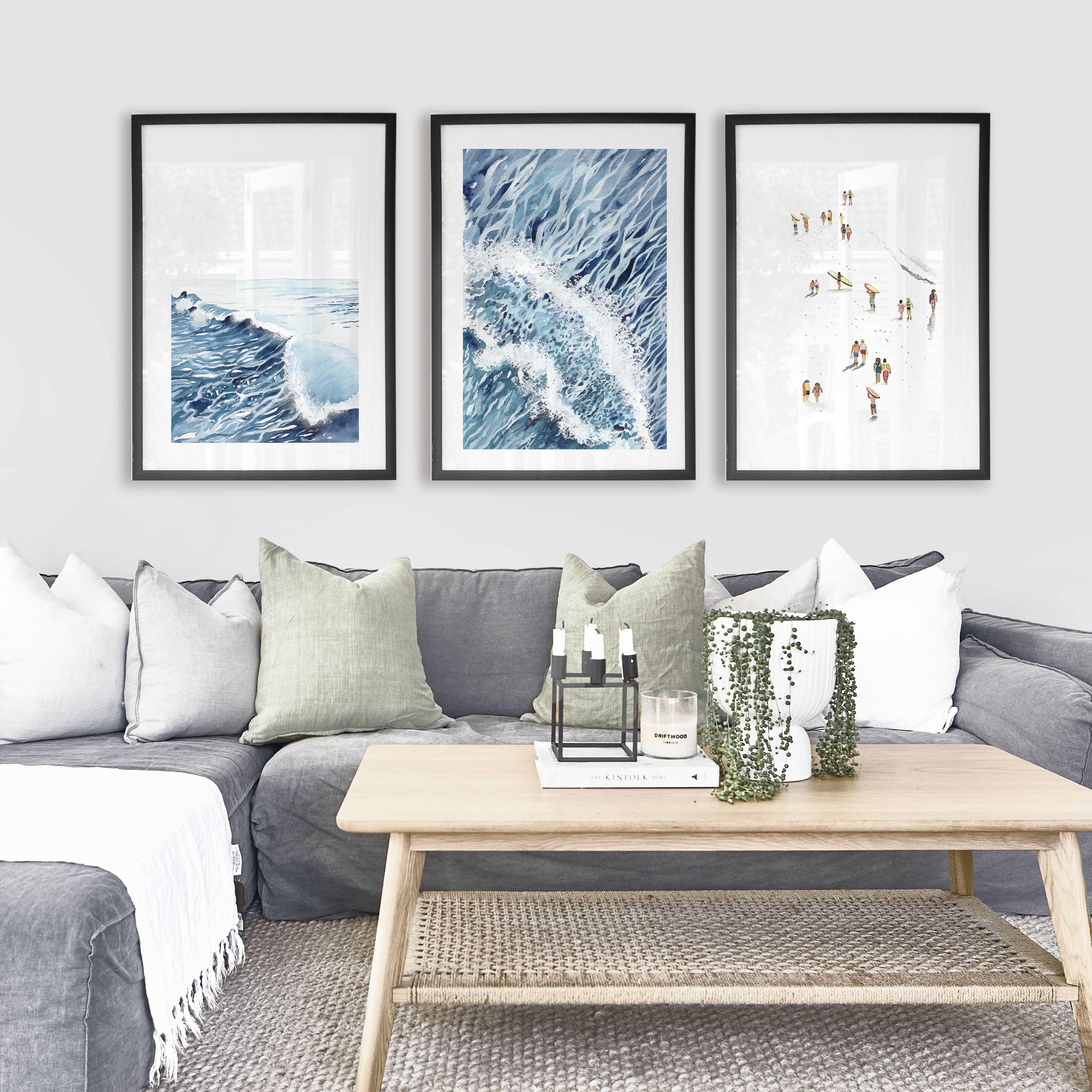 Golden Sandscapes, lapping waves and rocky shores, our Coastal Triplet is a collection of our charming coastal-themed artworks. This Triplet includes: Blue wave, Ocean Views, Surfers II Uniquely designed by Leden., designed to fit a range of interiors